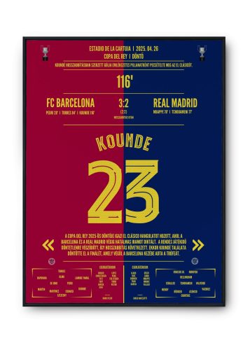 Koundé aranygólja döntötte el az El Clásicót! A Barcelona a hosszabbítás 116. percében szerezte meg a kupadöntő győztes találatát, ezzel trófeát emelhetett a Real Madrid ellen. Szerezd meg ezt a drámai futballpillanatot megörökítő posztert 30×40 vagy 40×50 cm-es prémium méretben!