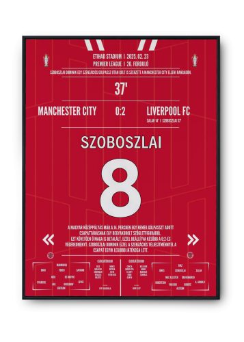 Szoboszlai Dominik ragyogása az Etihadban! A magyar középpályás gólpasszt adott, majd egy bődületes találattal maga is betalált a Manchester City ellen, ezzel 0–2-re növelve a Liverpool előnyét. Rendeld meg ezt a legendás pillanatot megörökítő posztert 30×40 vagy 40×50 cm-es prémium méretben!