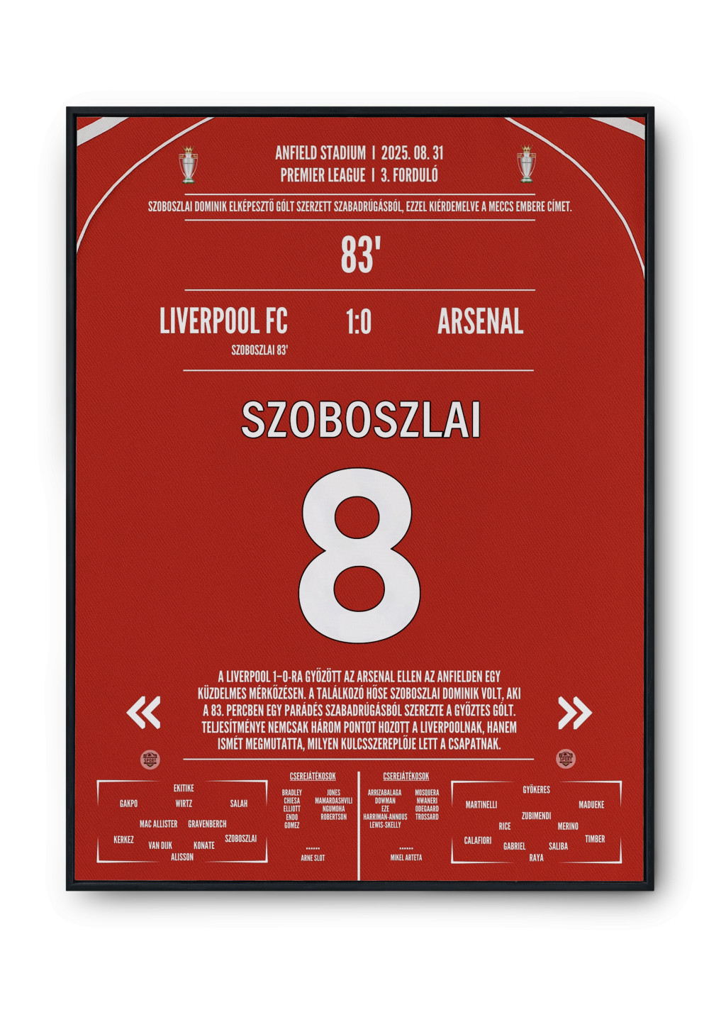 A poszter a gól legfontosabb elemeit, a meccs adatait és Szoboszlai nevét hangsúlyozza, modern, letisztult dizájnban. Tökéletes választás Liverpool-szurkolóknak, Szoboszlai-rajongóknak és mindenkinek, aki szereti megőrizni a felejthetetlen futballpillanatokat.